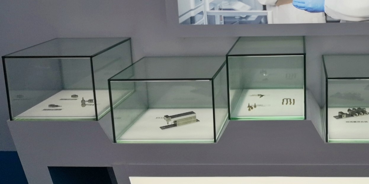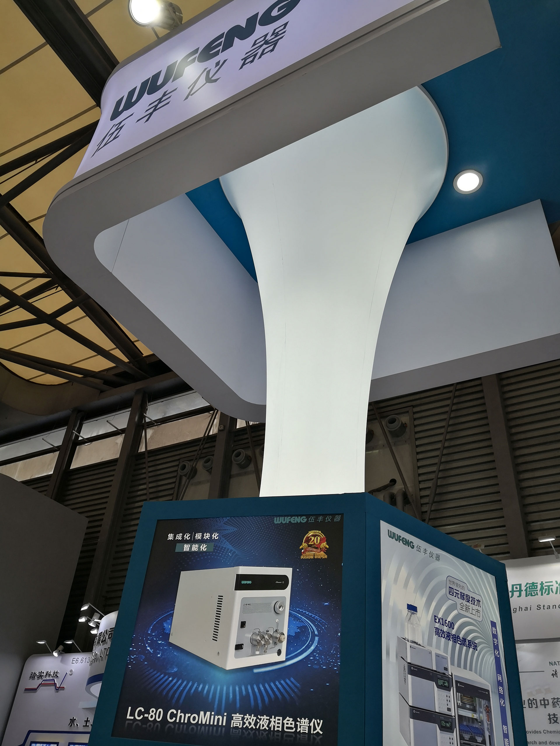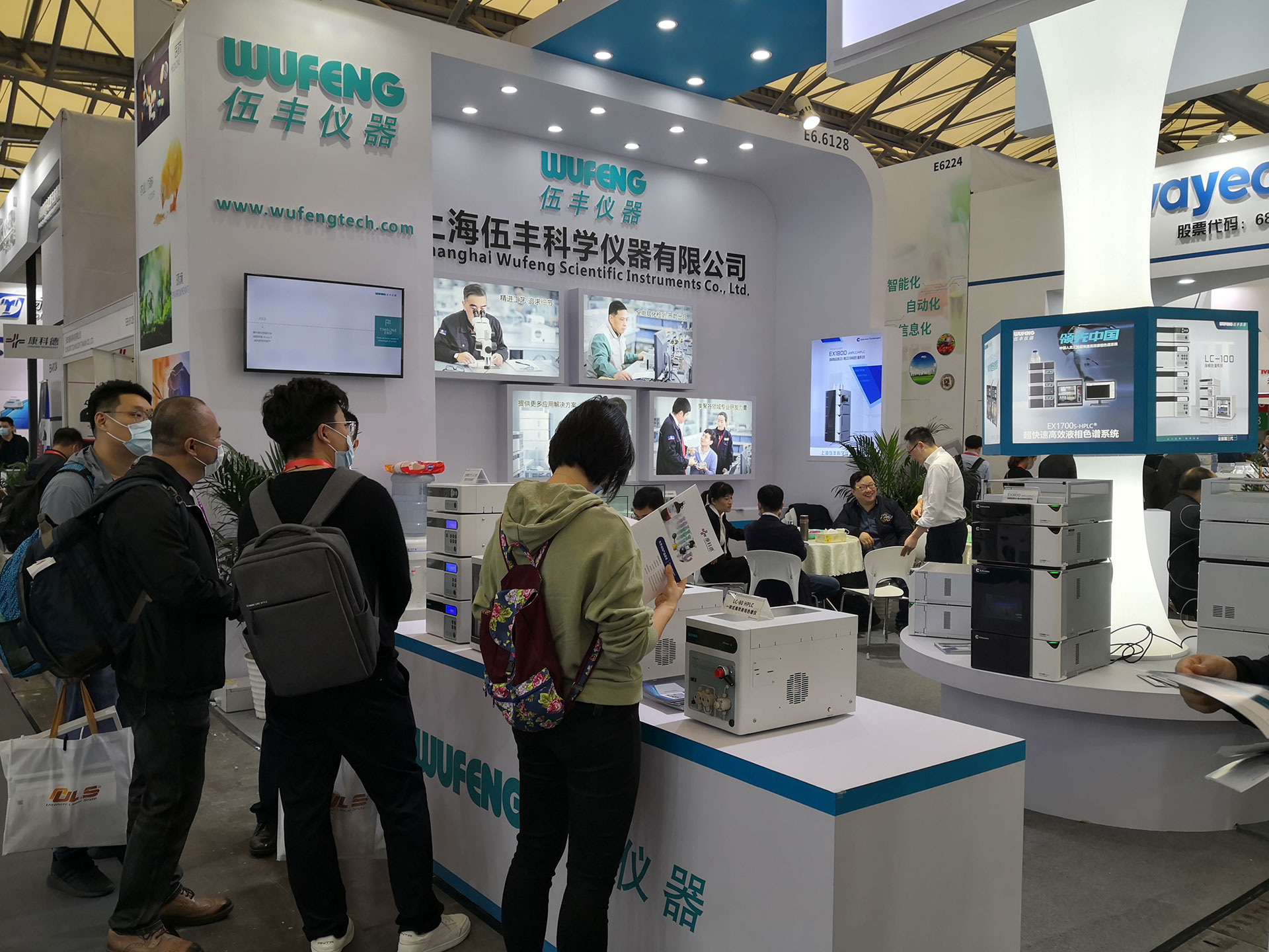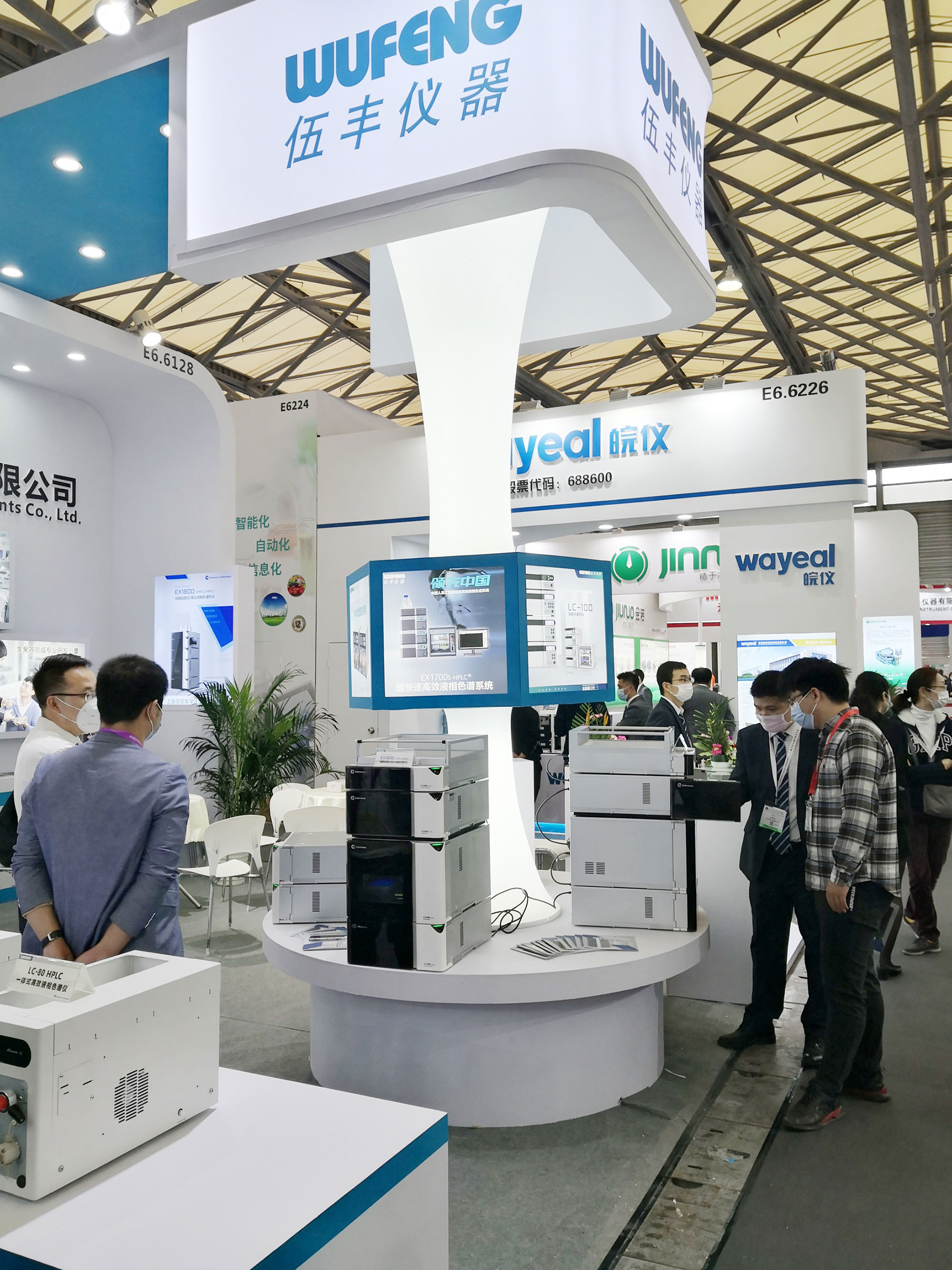 長型展臺放置伍豐全系列液相產品、錯落有致的零部件展臺,展示足以彰顯伍豐工藝品質的柱管、混合器、保護柱…… 最中心的C位當仁不讓留給旗艦產品-EX1800超高效/高效液相色譜系統。