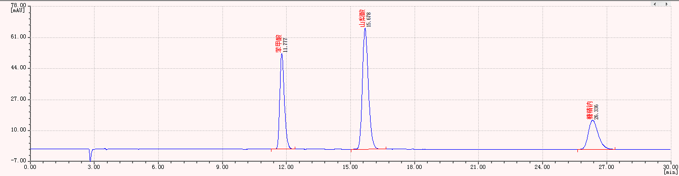 對照品溶液:分別將苯甲酸,山梨酸,糖精鈉標(biāo)準(zhǔn)品配成1mg/mL的溶液。然后分別用甲醇將苯甲酸鈉,山梨酸鉀溶液稀釋成0.32mg/mL,0.16mg/mL,0.08mg/mL,0.04mg/mL,0.02mg/mL的溶液。糖精鈉溶液用水稀釋成0.32mg/mL,0.16mg/mL,0.08mg/mL,0.04mg/mL,0.02mg/mL的溶液。