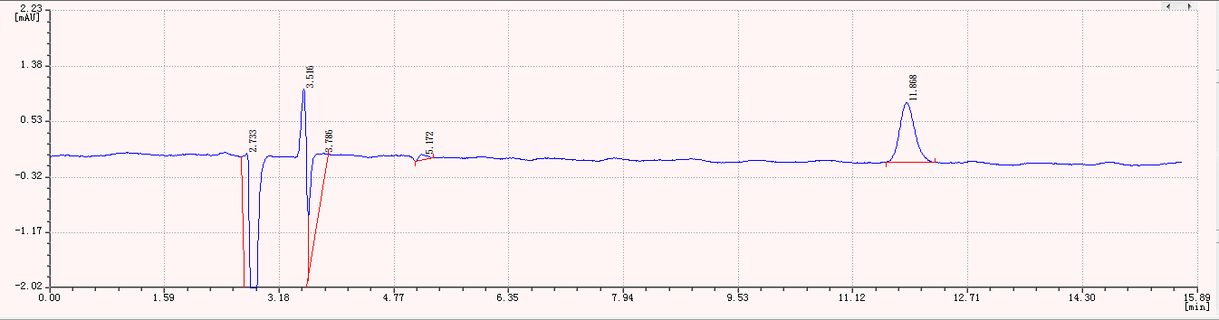 將上述配好的雪碧溶液吸取10?μL注入液相色譜儀記錄色譜峰面積,使用外標(biāo)法計(jì)算含量。測得市售雪碧中苯甲酸的含量為0.14g/kg。小于國家規(guī)定的0.2g/kg的標(biāo)準(zhǔn)。