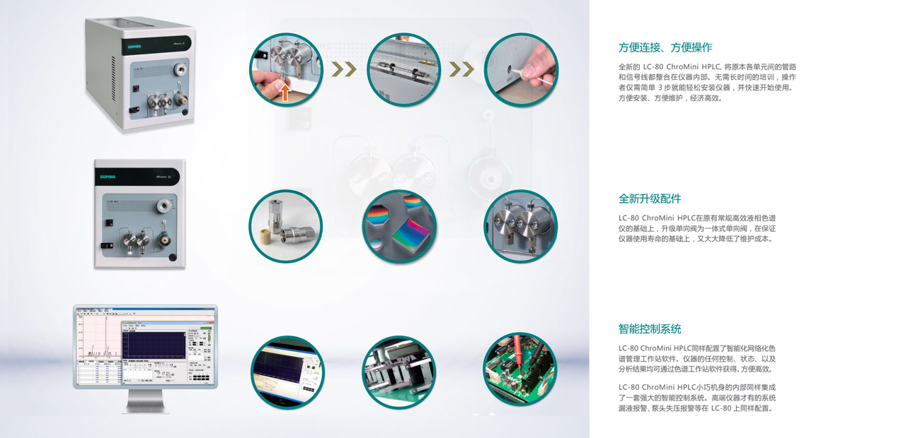 LC-80具有高度集成化、小型化、模塊化、智能化等特點,操作簡單、維護成本低、移動性強。采用領先的微電腦技術,只需連接電腦色譜工作站軟件,就能輕松控制整臺儀器,使分析工作化繁為簡。一體化設計大大減少了各單元間管路的距離和接口數量,從而減少了系統死體積和潛在的泄漏點,提高了儀器整體性能,也方便維護。