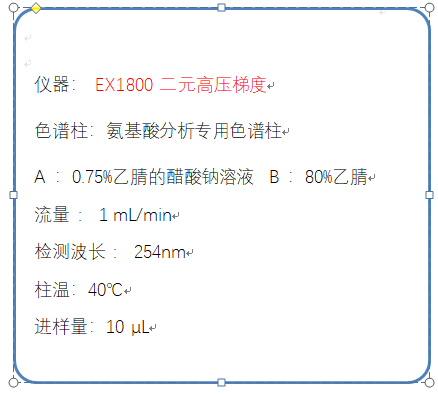 采用柱后衍生方法,使用EX1800高效液相色譜系統(tǒng),通過流動相切換控制采用專用氨基酸分析色譜柱,完成氨基酸的分析與檢測。